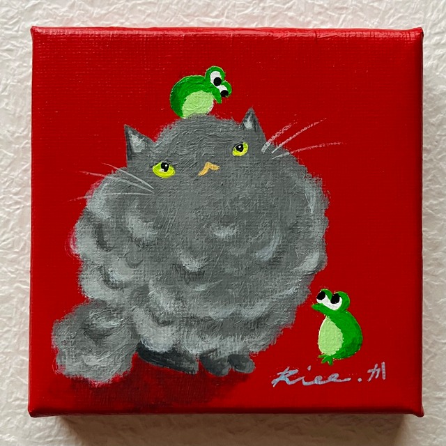 「KUMORIちゃんと雨蛙」 原画 アクリル画 ミニキャンバス 100×100mm ミニイーゼル付き 猫 雨 雨蛙 カエル 原画 ミニキャンバス インテリア 《Riee.かプロフィール》 女性・猫・錦鯉・龍を主に描く。頭にパッと浮かんでたものや夢の中で描いていた絵を記憶し、それを出来る限り忠実に描くスタイル。 2020年10月からサウンドプロデューサー+ビートメイカーである「uruwashi」のミュージックジャケット、CDジャケットを担当。