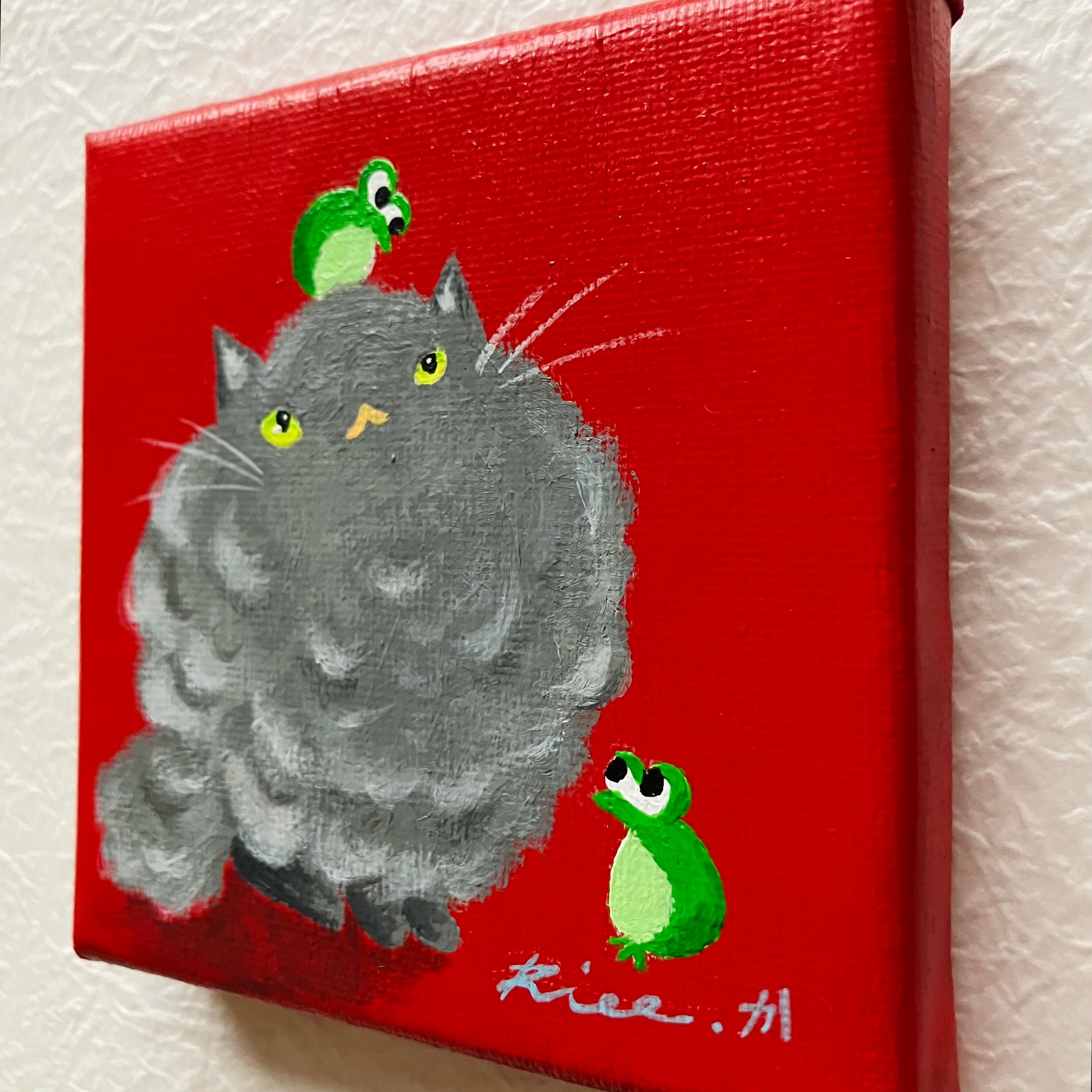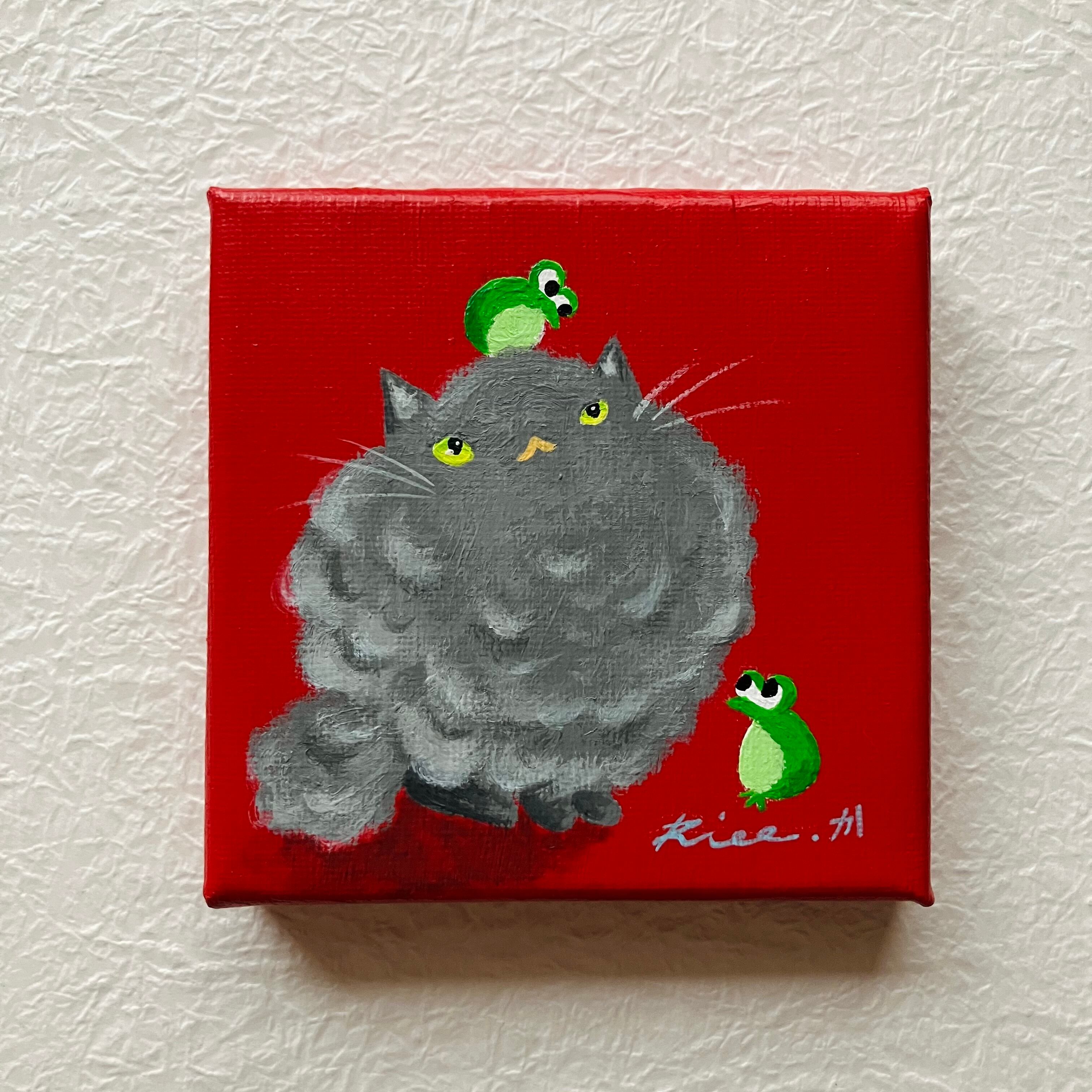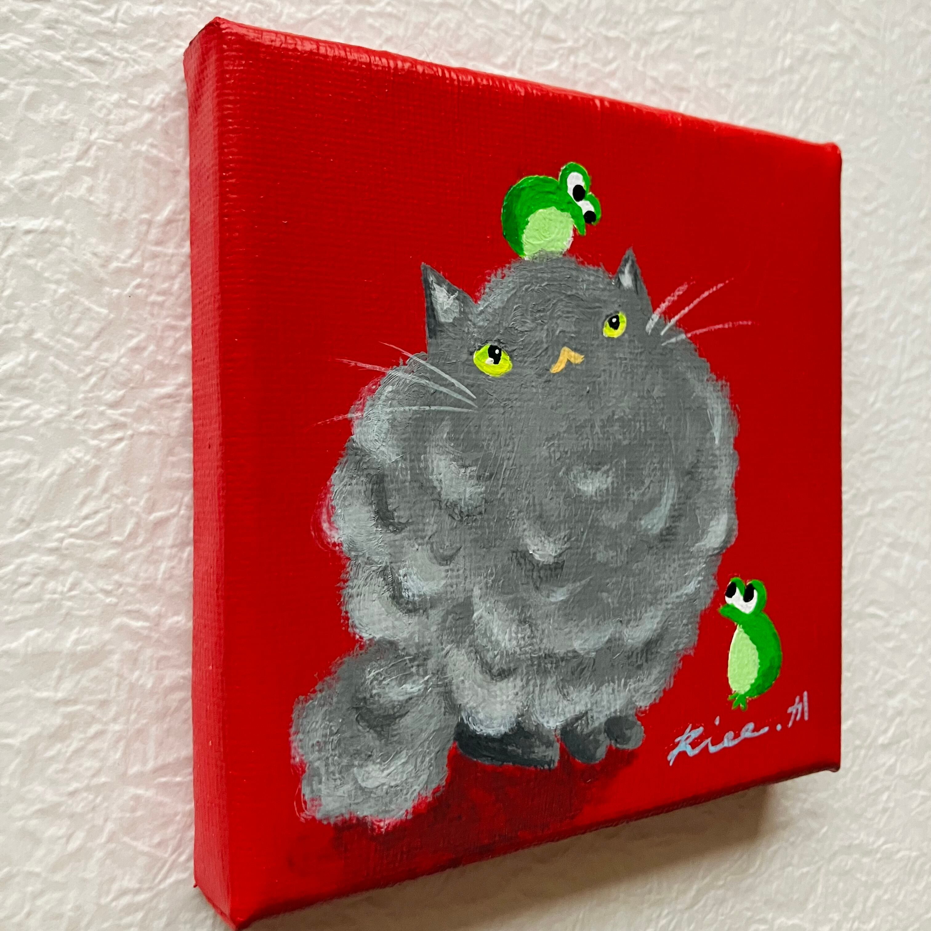 猫 雨 雨蛙 カエル 原画 ミニキャンバス インテリア