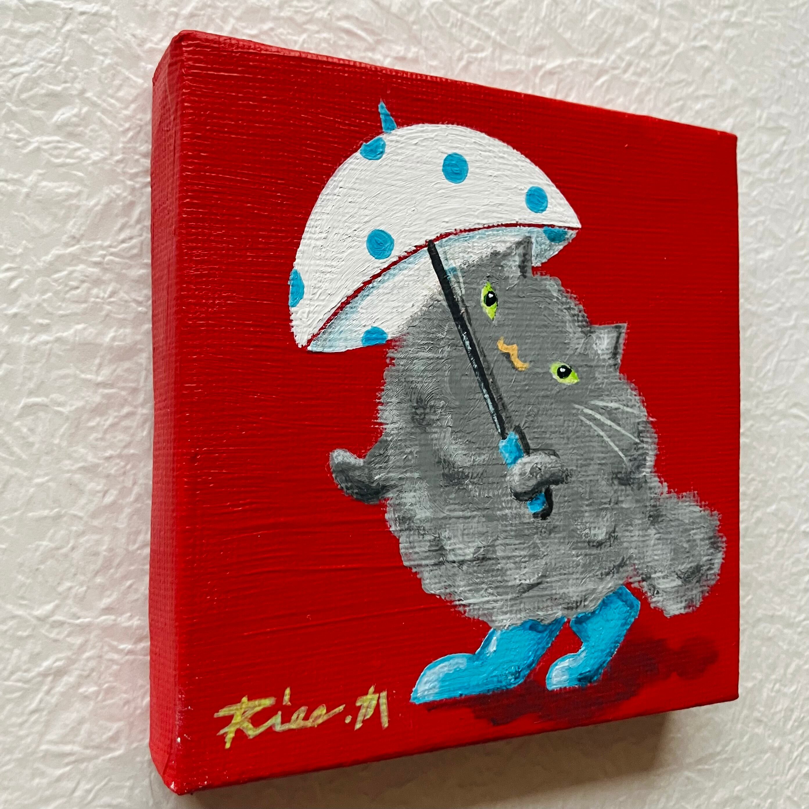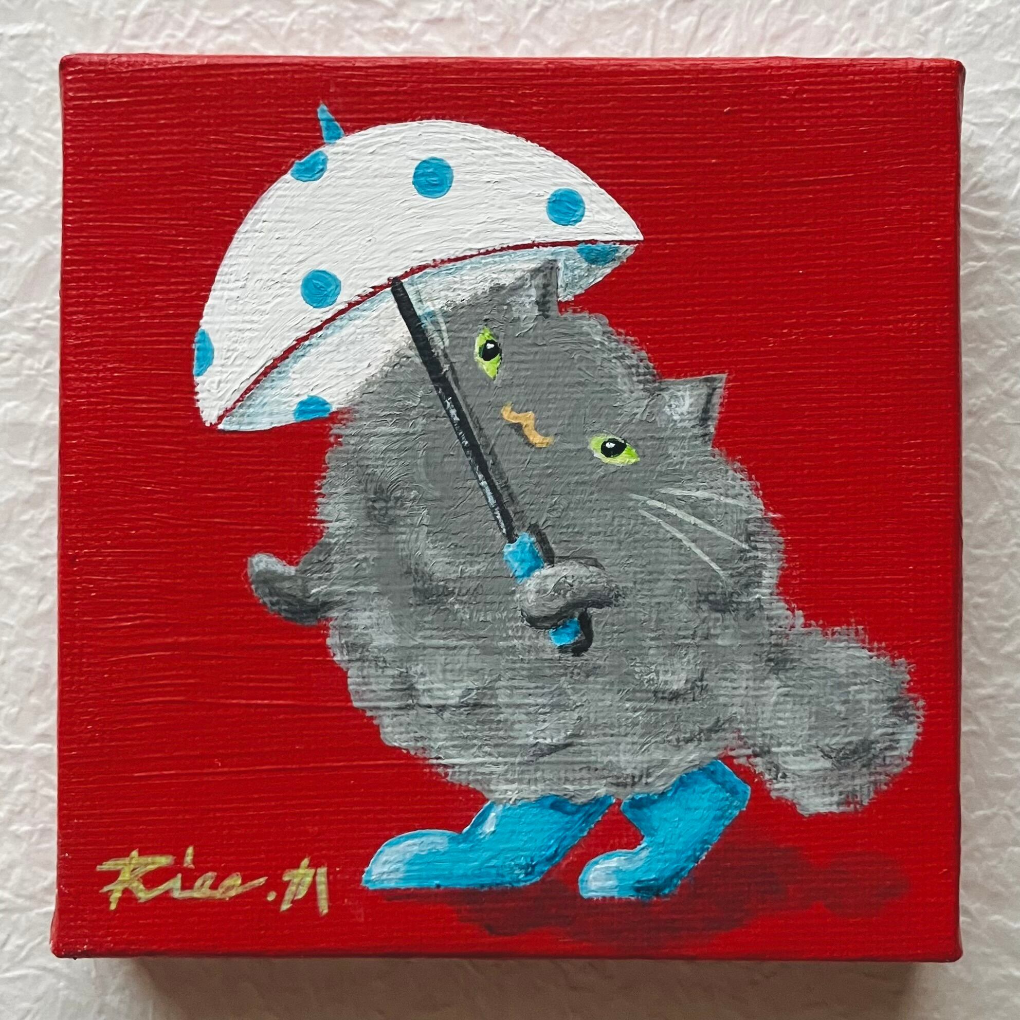 猫 雨 雨傘 傘 原画 ミニキャンバス インテリア