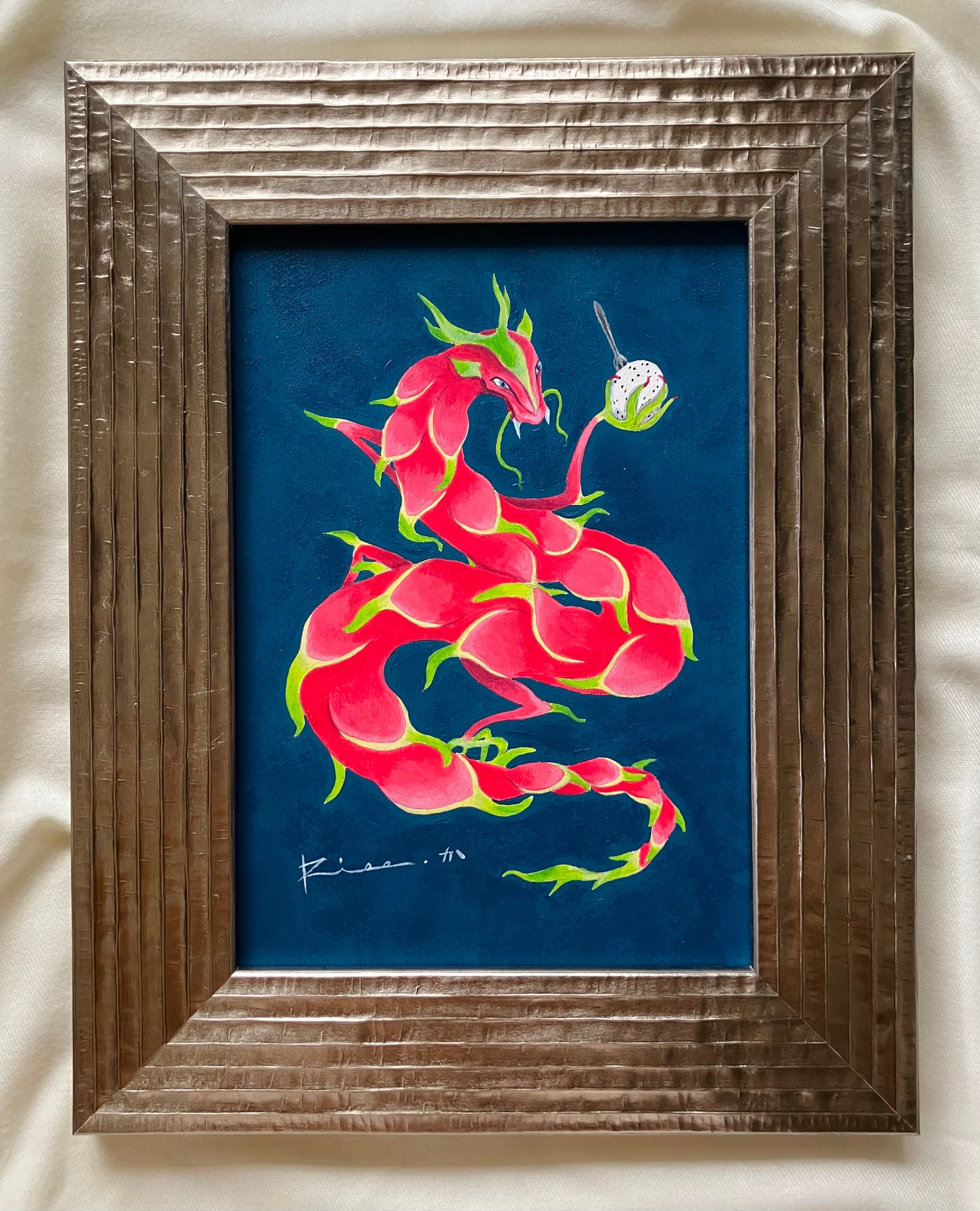 ドラゴンフルーツを鮮やかな龍として描いた作品。額縁は幅広で派手なシルバーで、全体的に渋い作品となります。