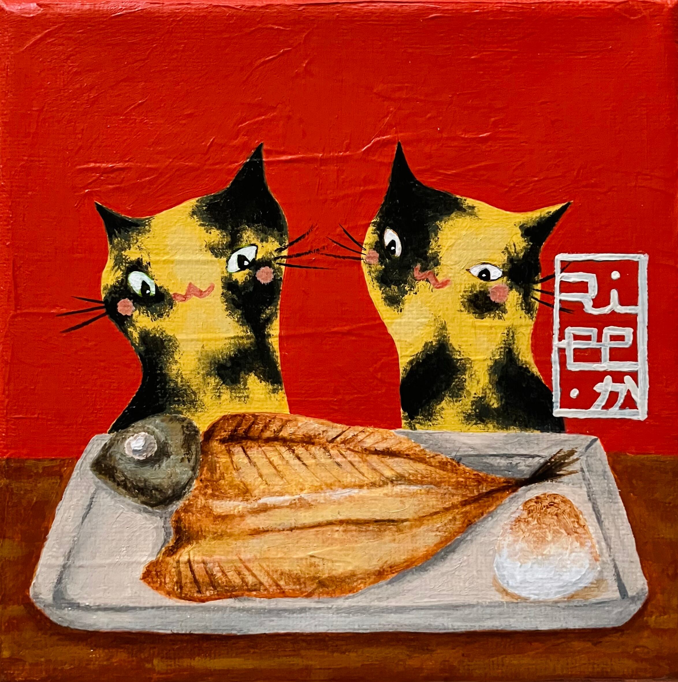 アジの干物をテーマにした作品。よくある朝食の風景に猫が加わり心温まる朝のひとときを演出します。