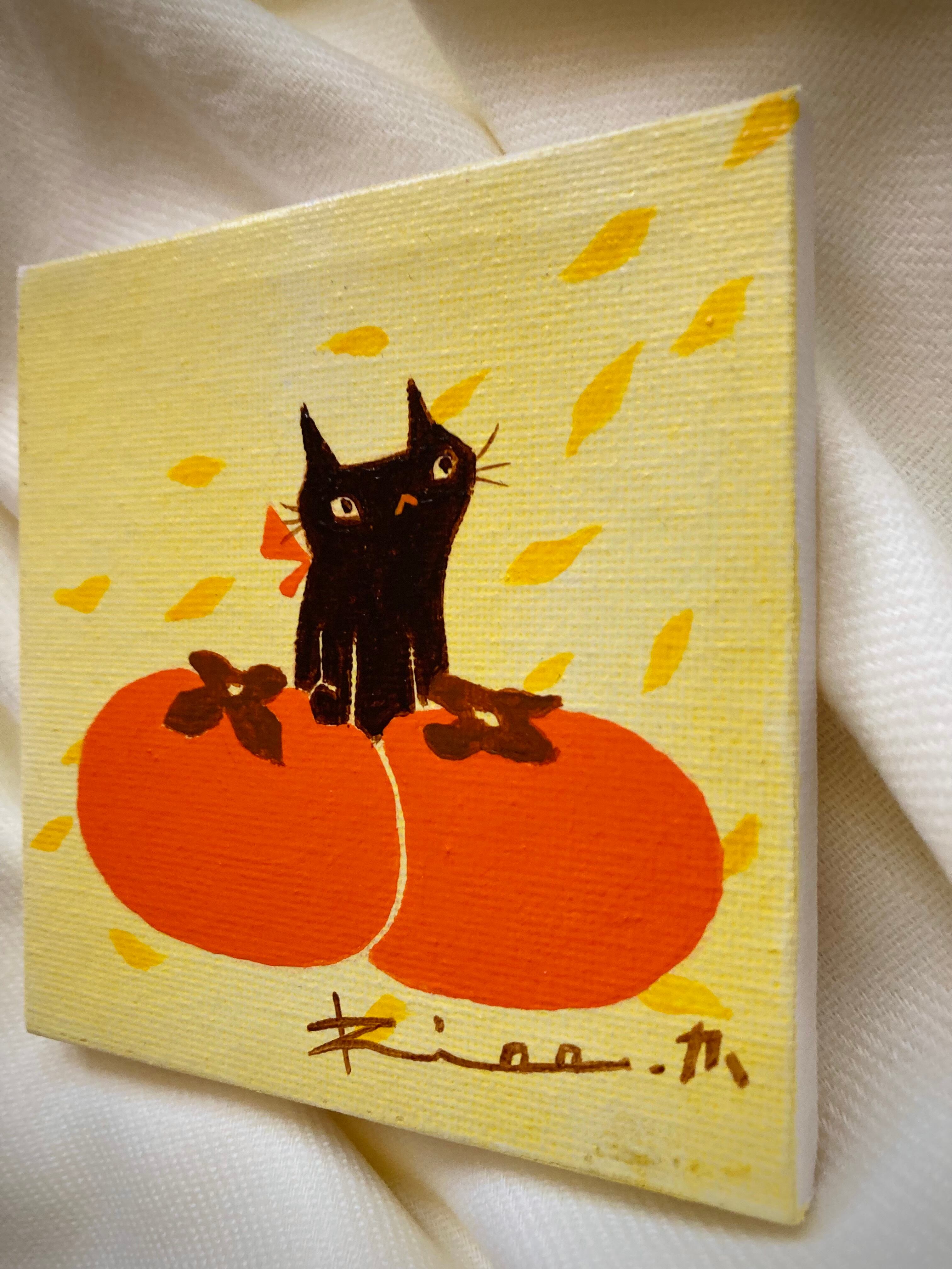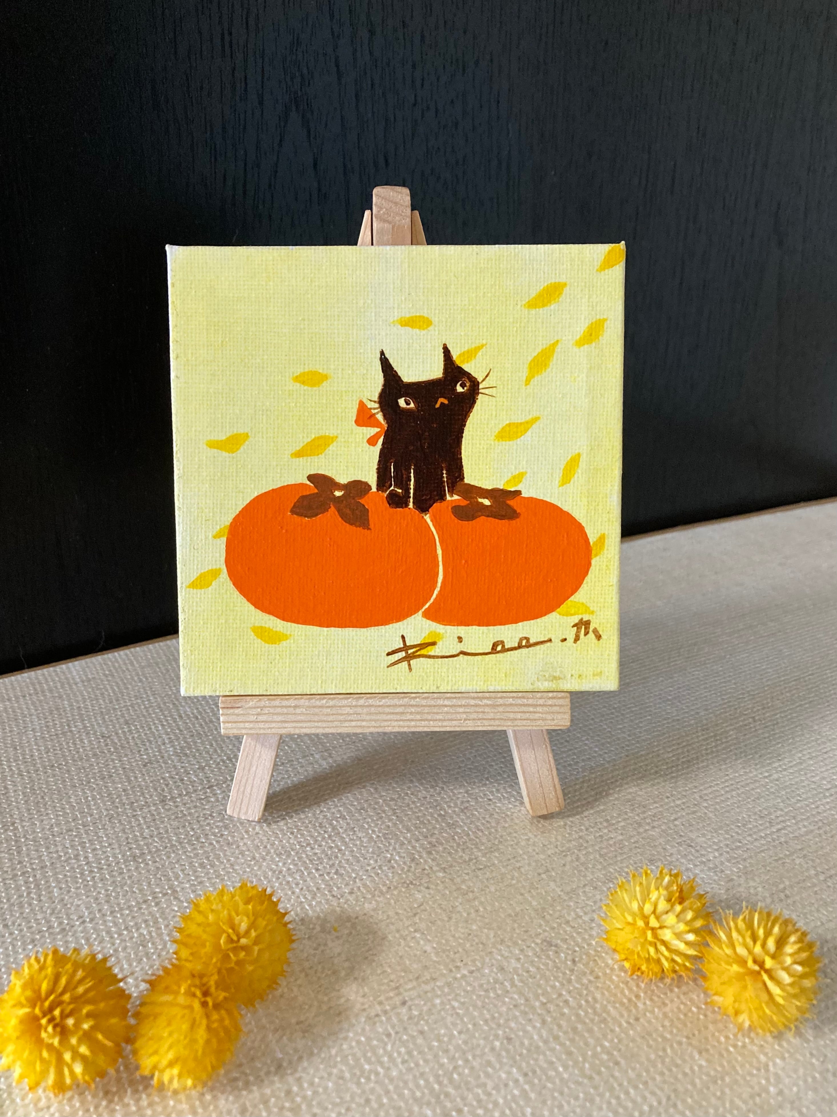 秋 小さい秋 黒猫 柿 猫 絵 イラスト ミニキャンバス 絵画 アート インテリア