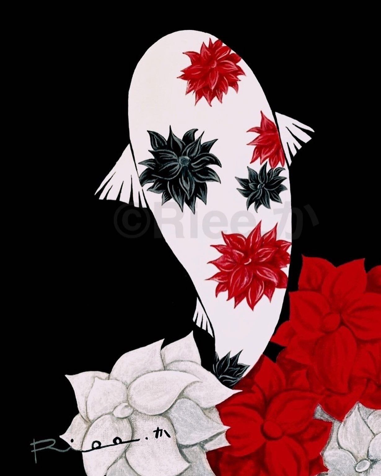 女性・猫・錦鯉・龍を主に描く。頭にパッと浮かんできたものや夢の中で描いていた絵を記憶し、それを出来る限り忠実に描くスタイル。