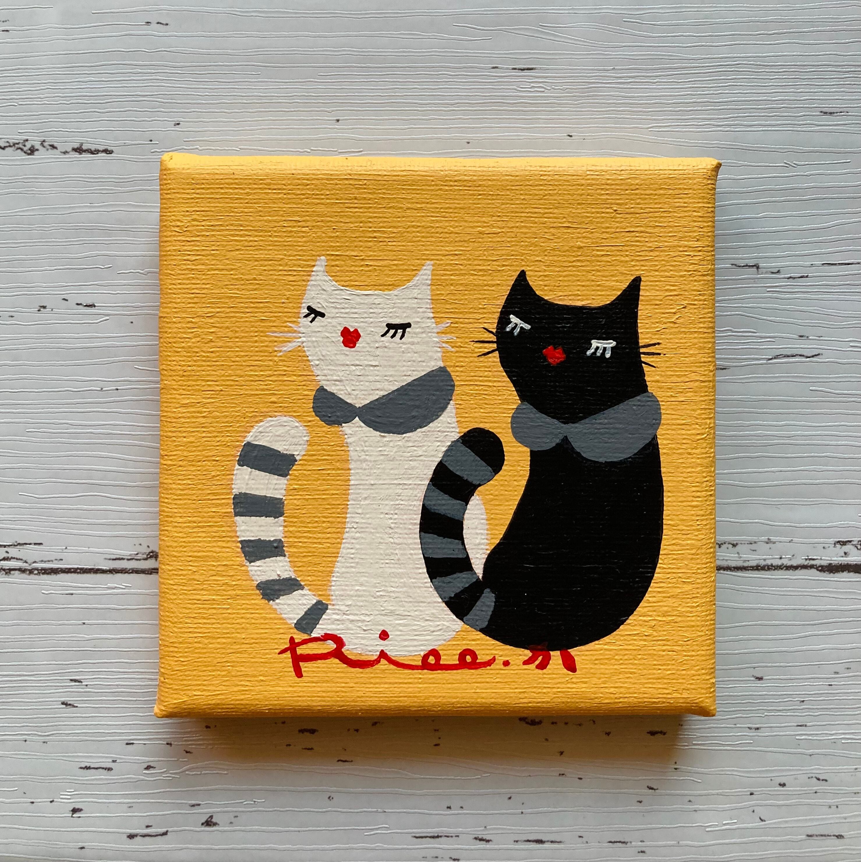 猫 白猫 黒猫 しっぽ シマシマ ボーダー 絵 イラスト アート 絵画 ミニキャンバス 原画 インテリア