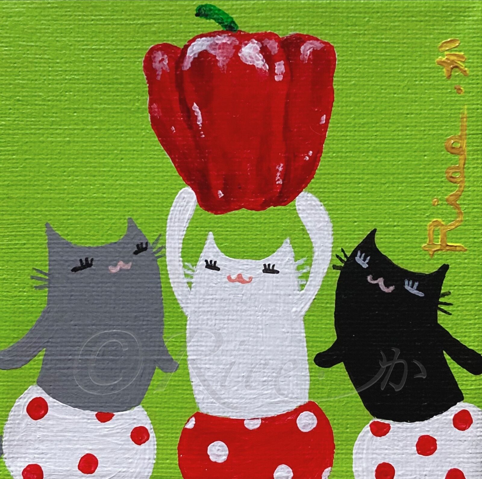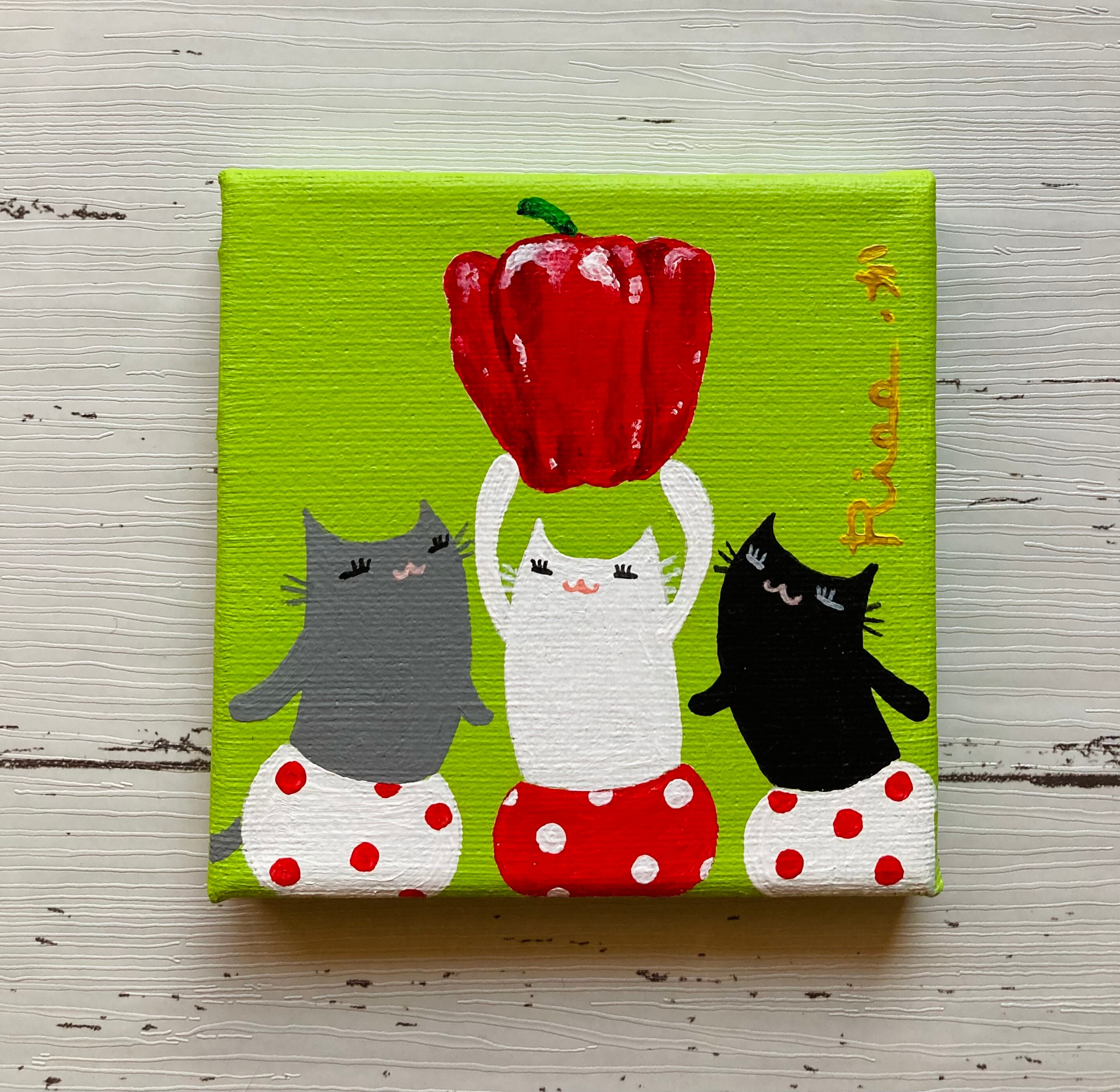 猫 白猫 グレー猫 黒猫 パプリカ 水玉おパンツ 絵 イラスト アート 絵画 原画 ミニキャンバス インテリア
