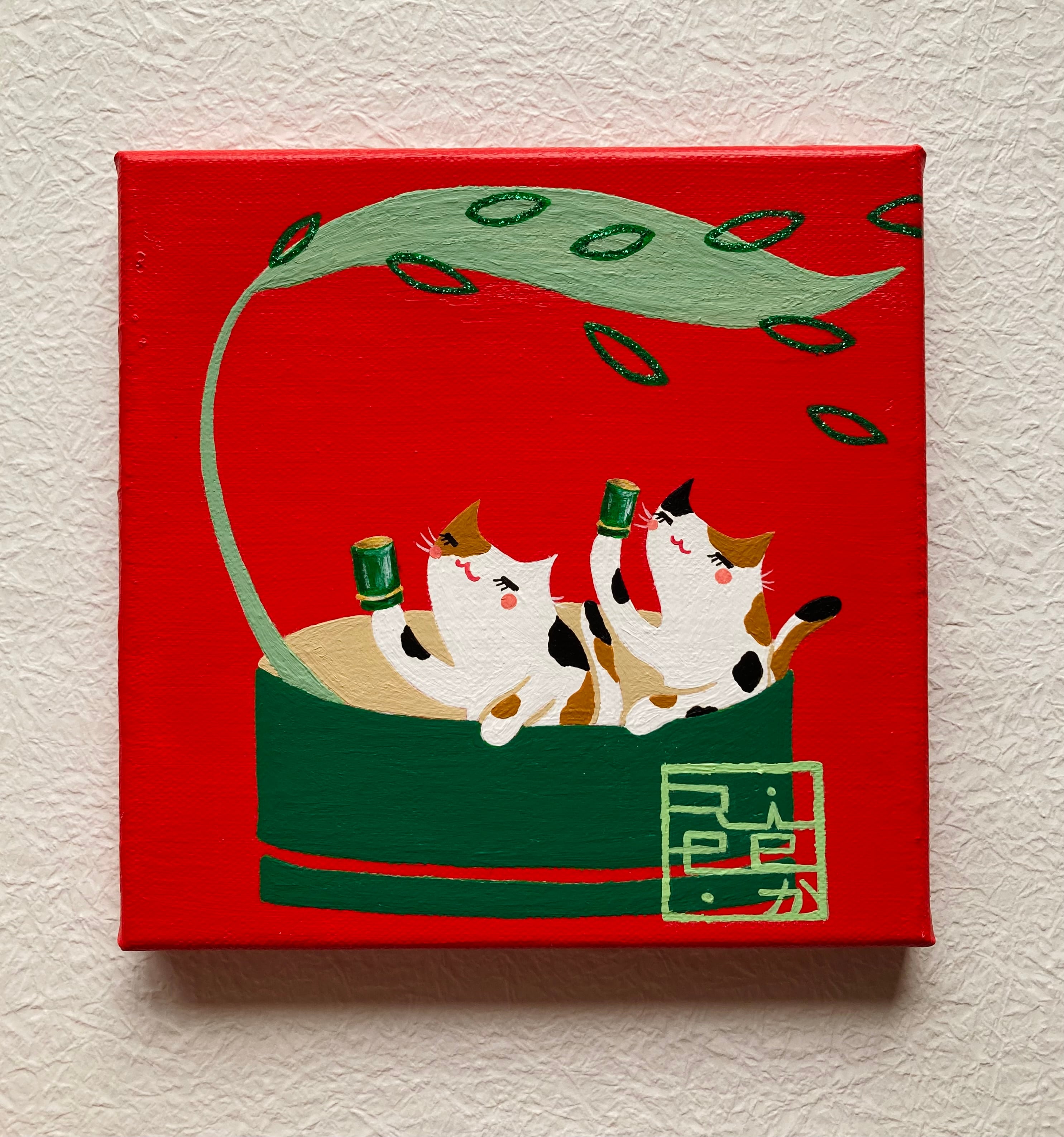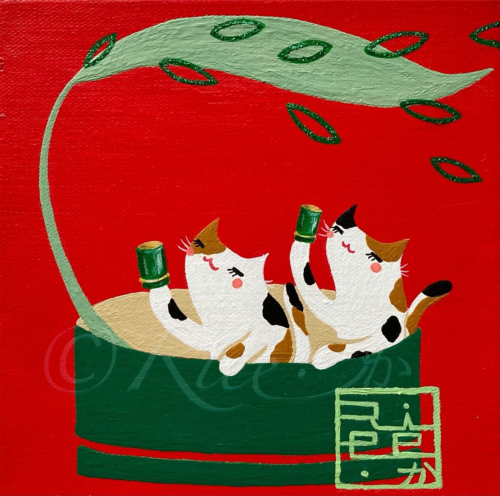 猫 三毛猫 日本酒 竹酒 七夕 竹 笹 キャンバス 原画 絵 絵画 アート イラスト インテリア