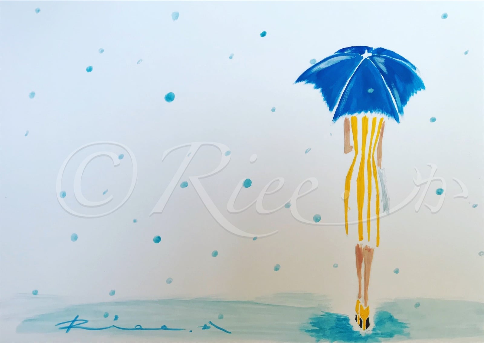 雨 雨傘 青い傘 絵 イラスト デザイン ミュージックジャケット アート 原画 イラストボード 額縁 インテリア