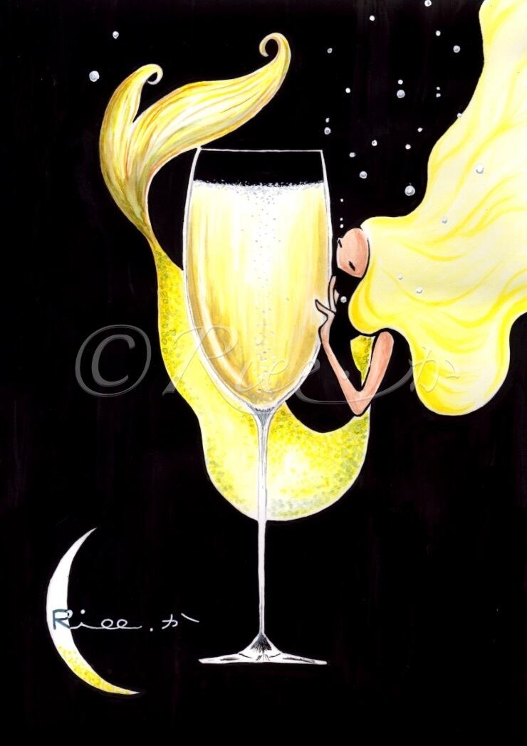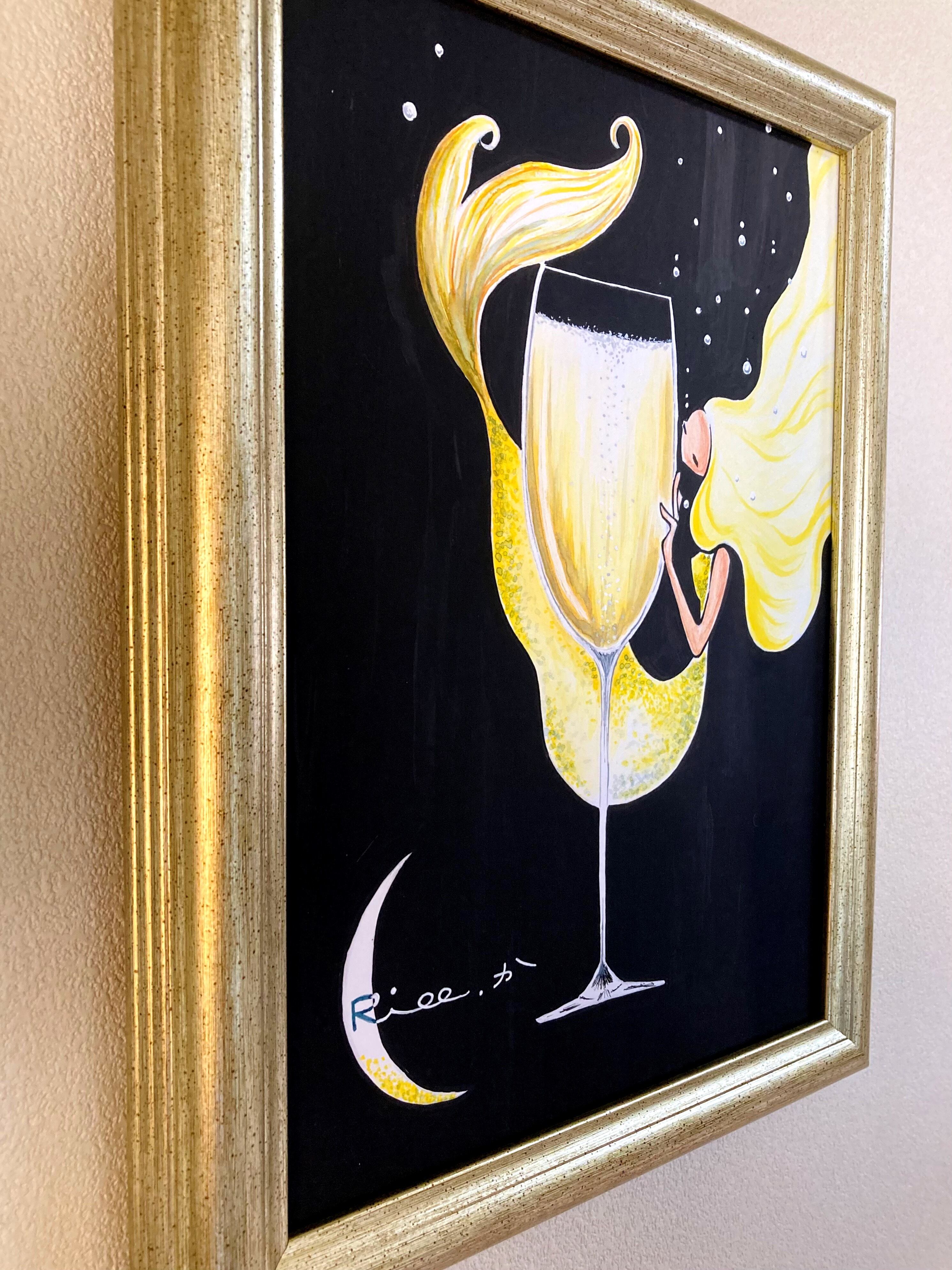 シャンパン 人魚 マーメイド 三日月 アート イラスト 絵 原画 額縁 インテリア