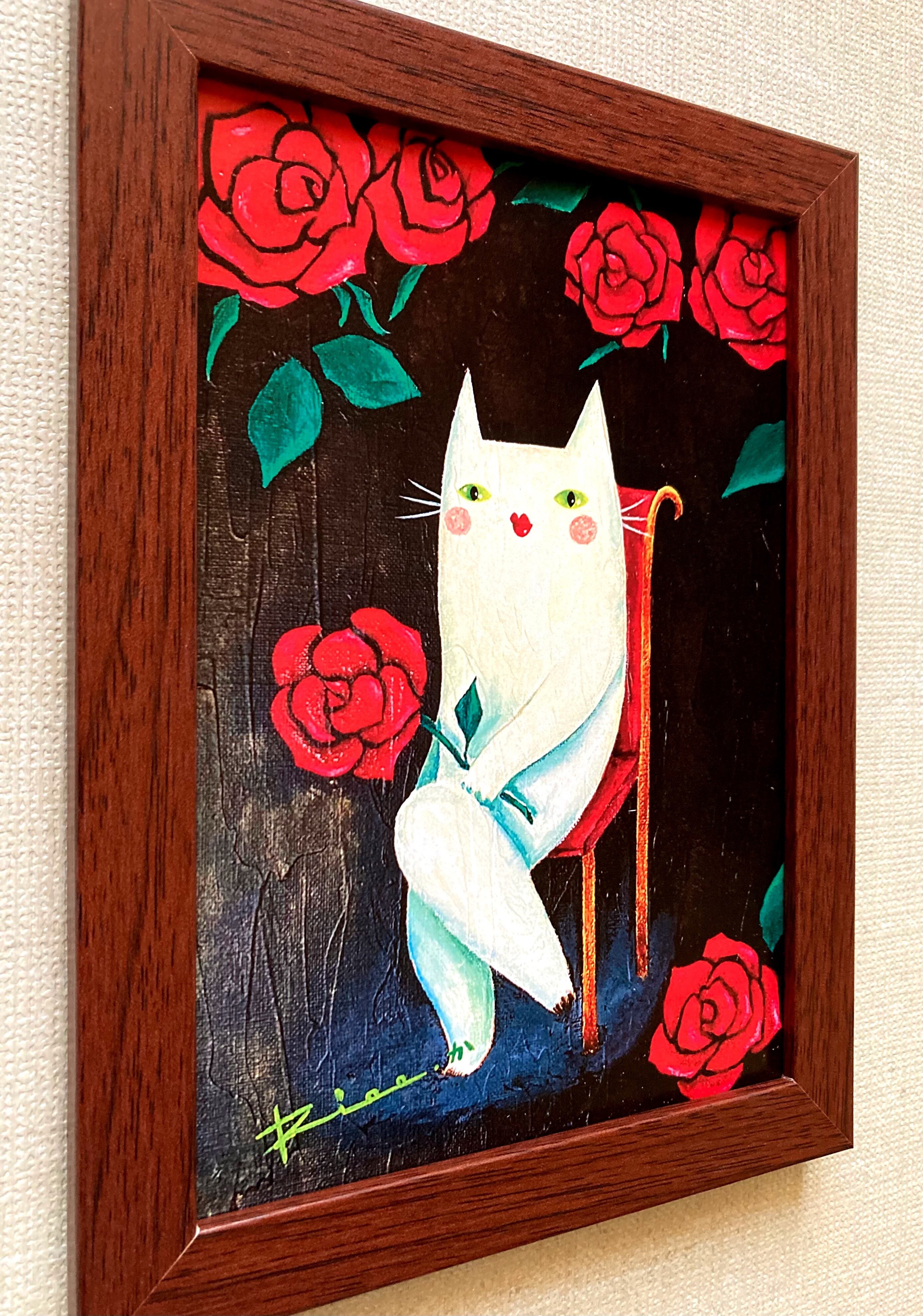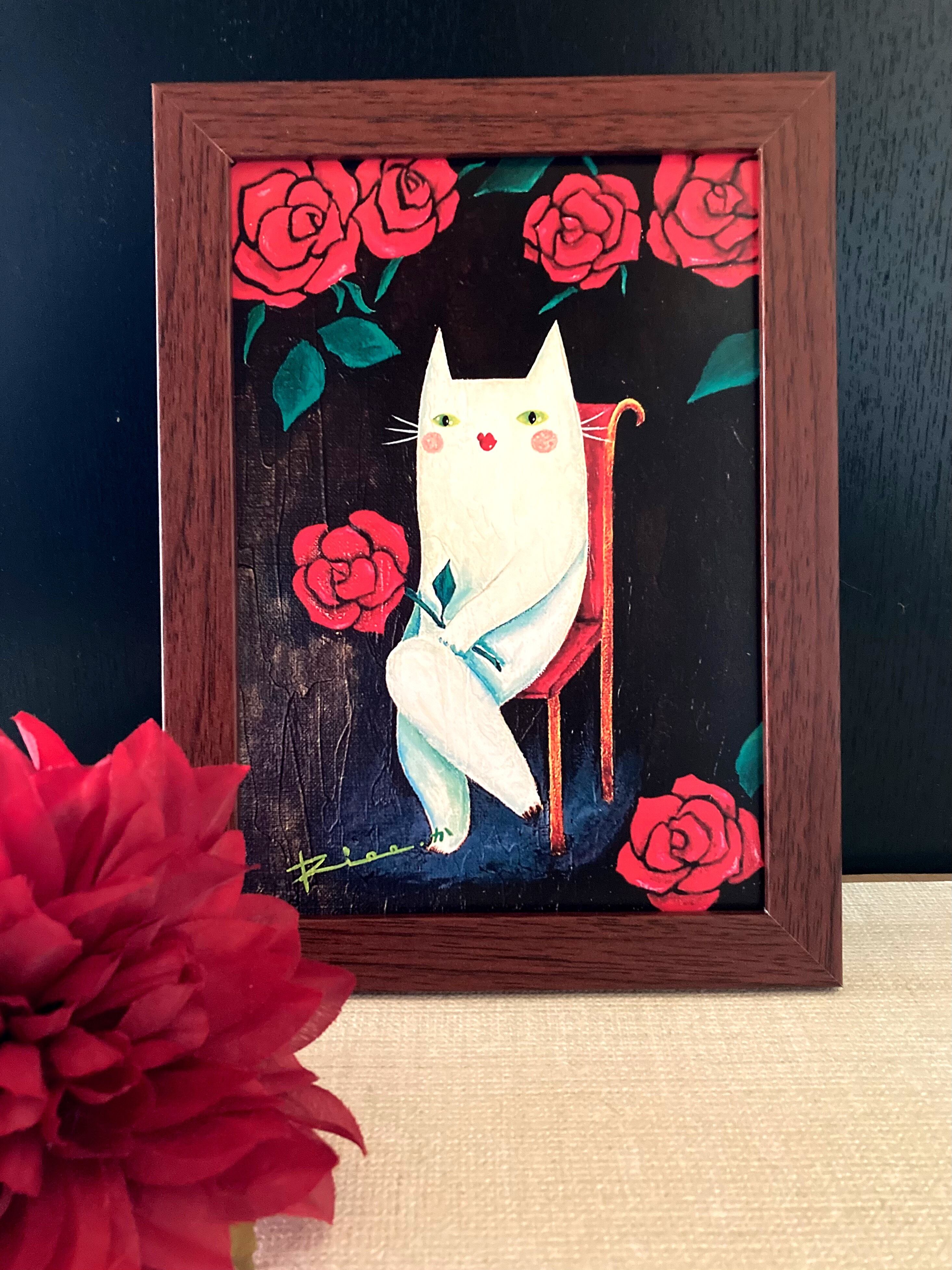 猫 白猫 薔薇 赤薔薇 バラ 花 絵 アート 額縁入り複製画 複製画 絵画 イラスト ポスター アートポスター インテリア
