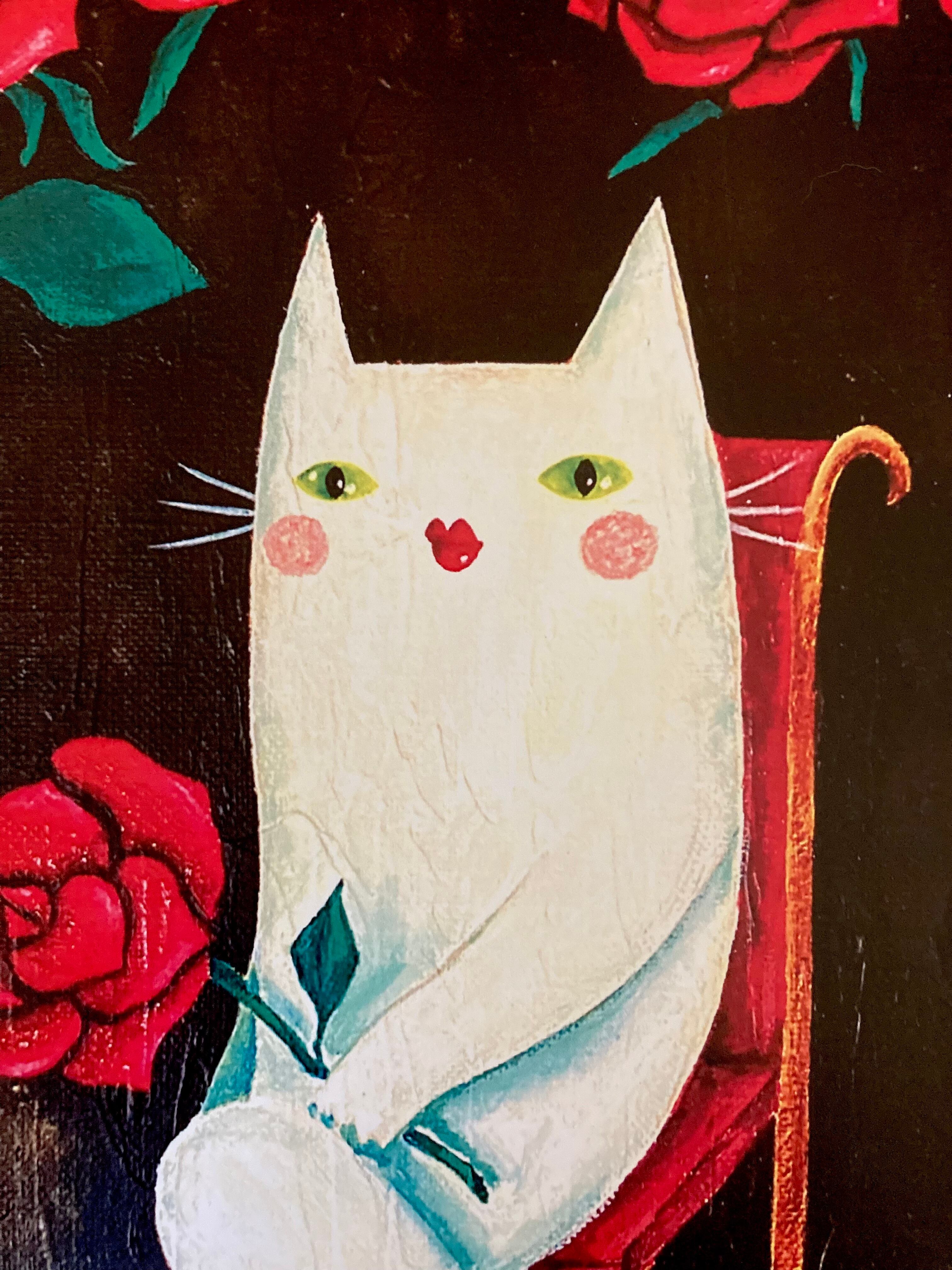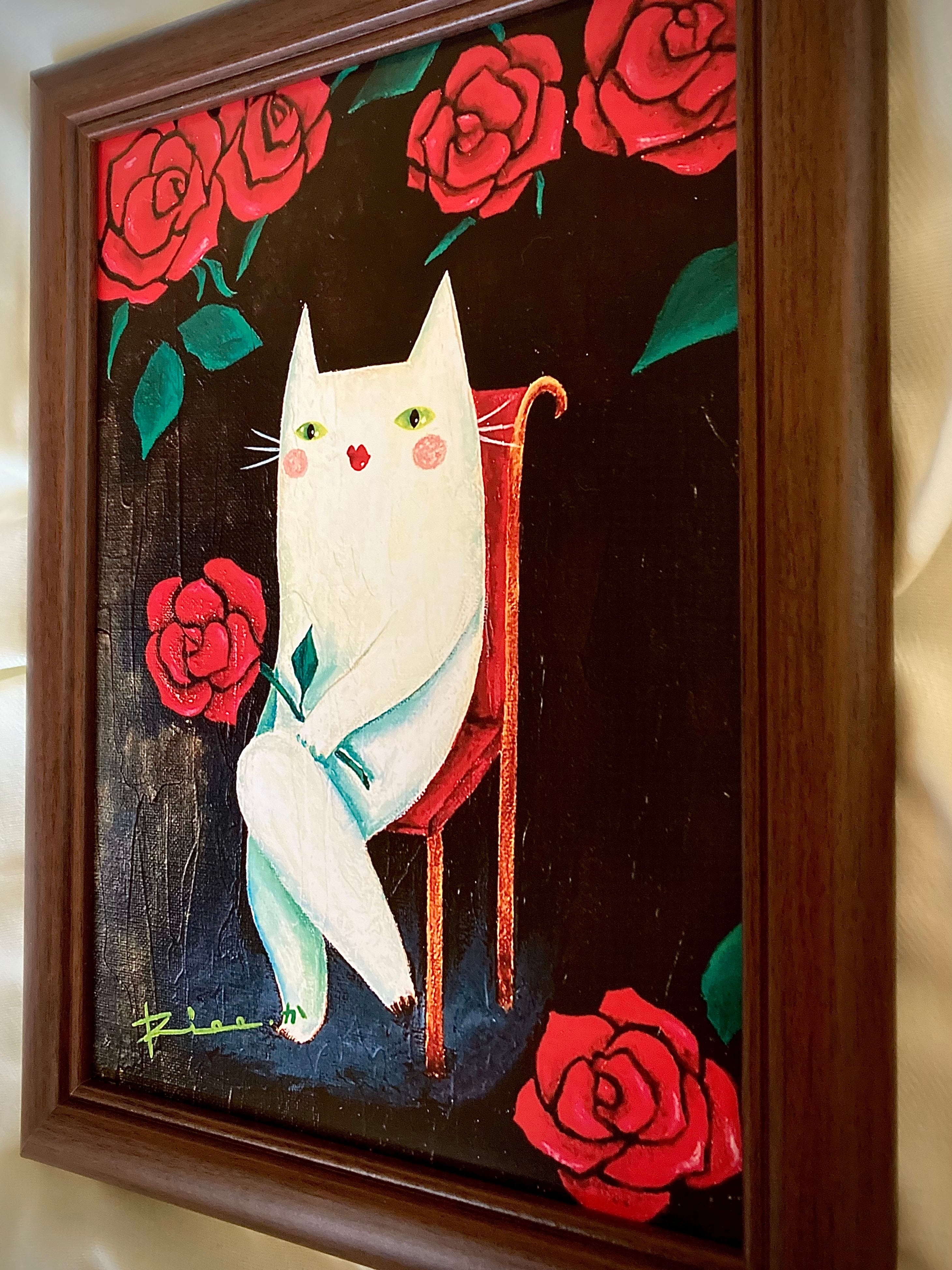 猫 白猫 花 赤薔薇 薔薇 バラ 絵 アート 額縁入り複製画 複製画 絵画 イラスト ポスター アートポスター インテリア