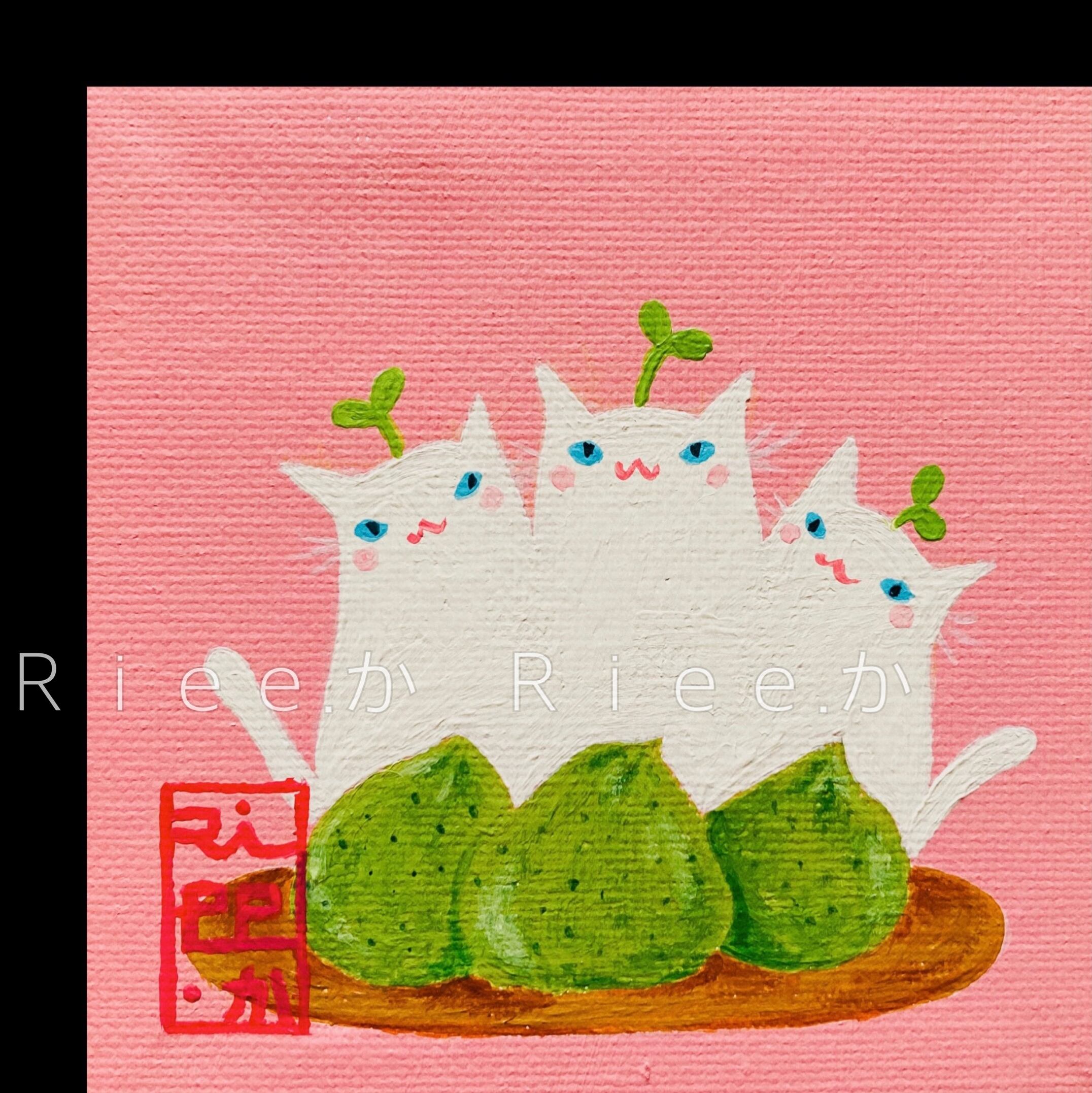 猫 白猫 餅 草餅 春 ミニキャンバス 原画 アート イラスト インテリア