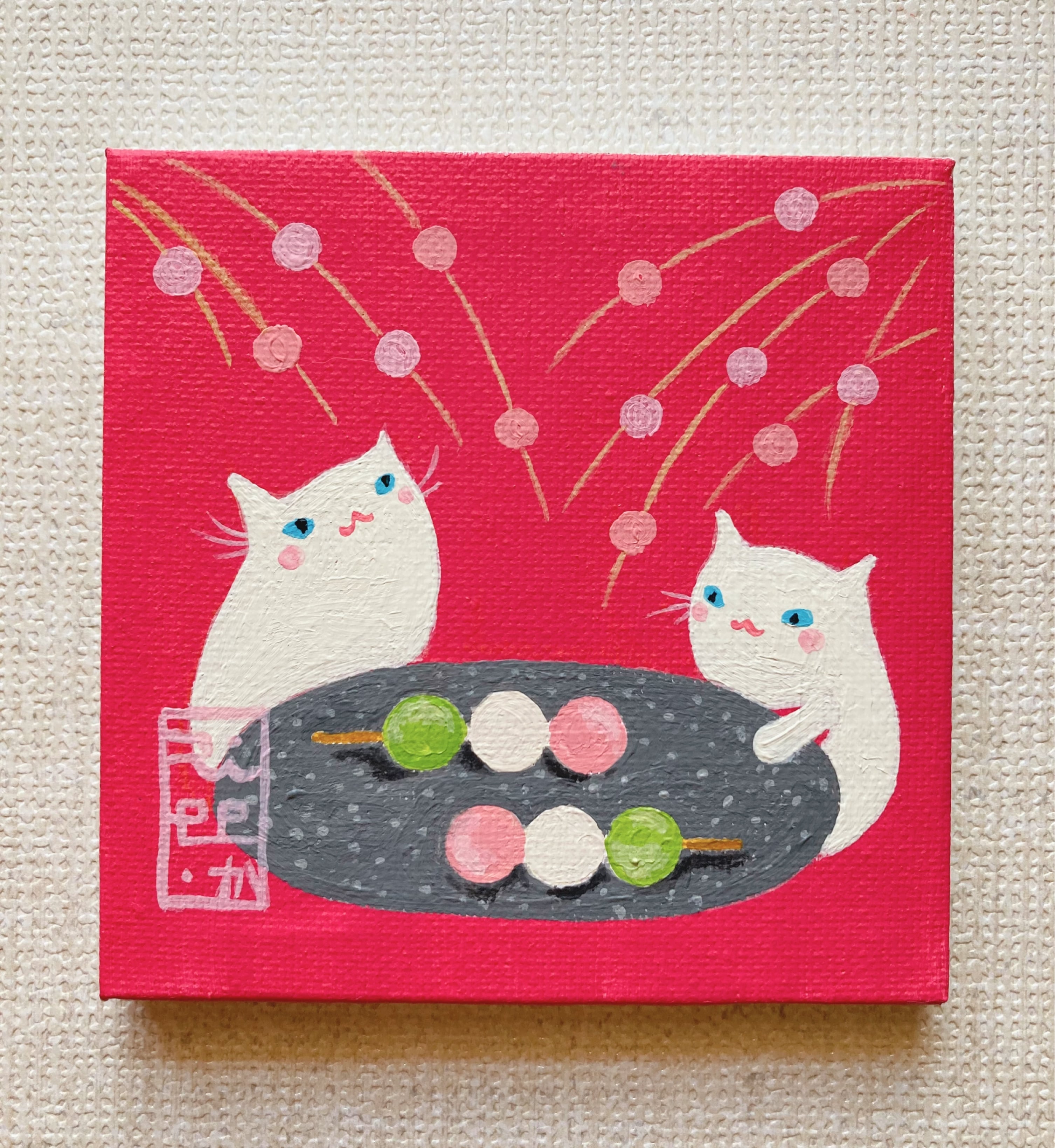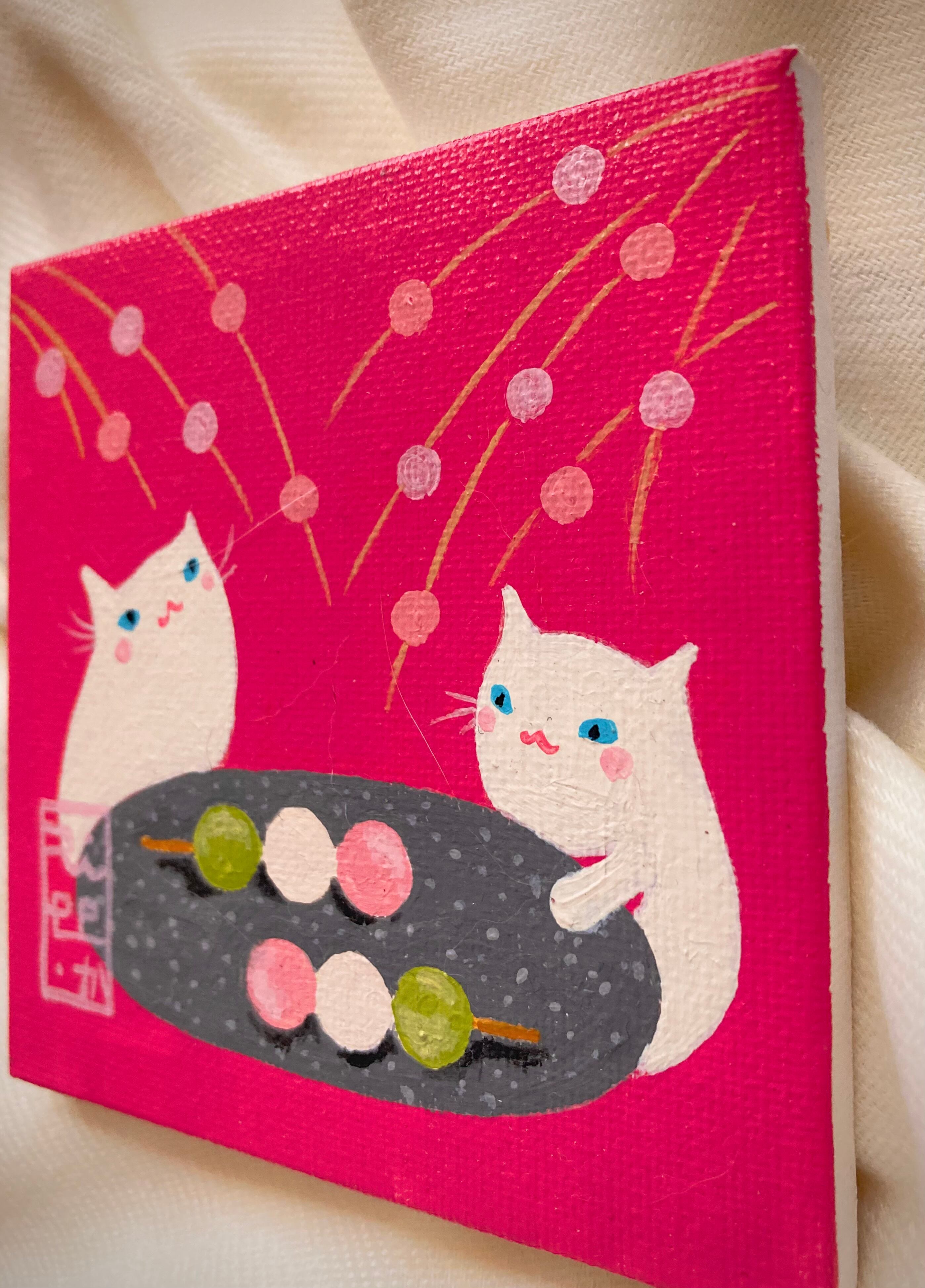 猫 白猫 お団子 春 原画 ミニキャンバス アート イラスト インテリア
