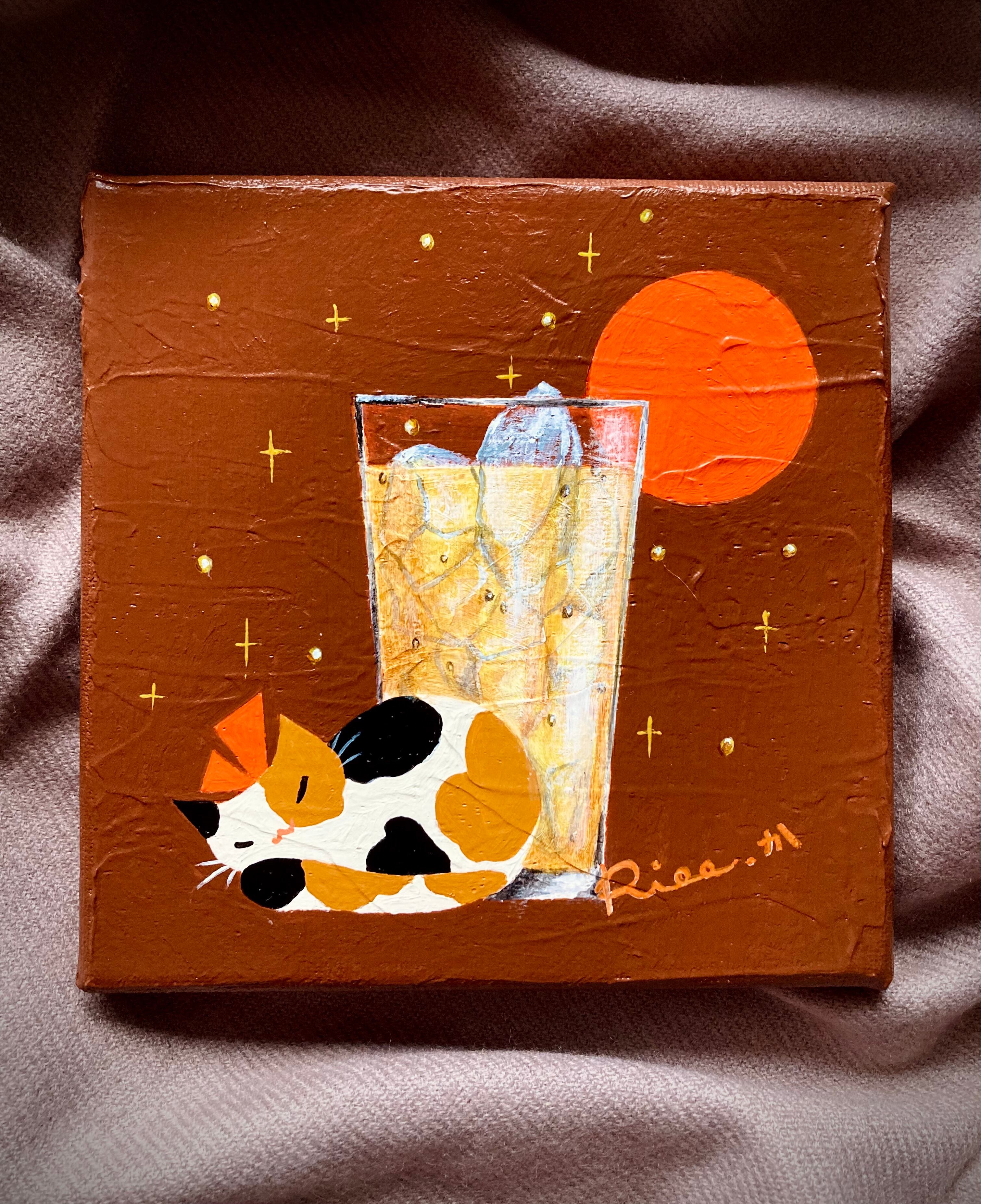 猫 三毛猫 ハイボール ウイスキー ソーダ割り お酒 満月 絵 アート イラスト 絵画 キャンバス インテリア