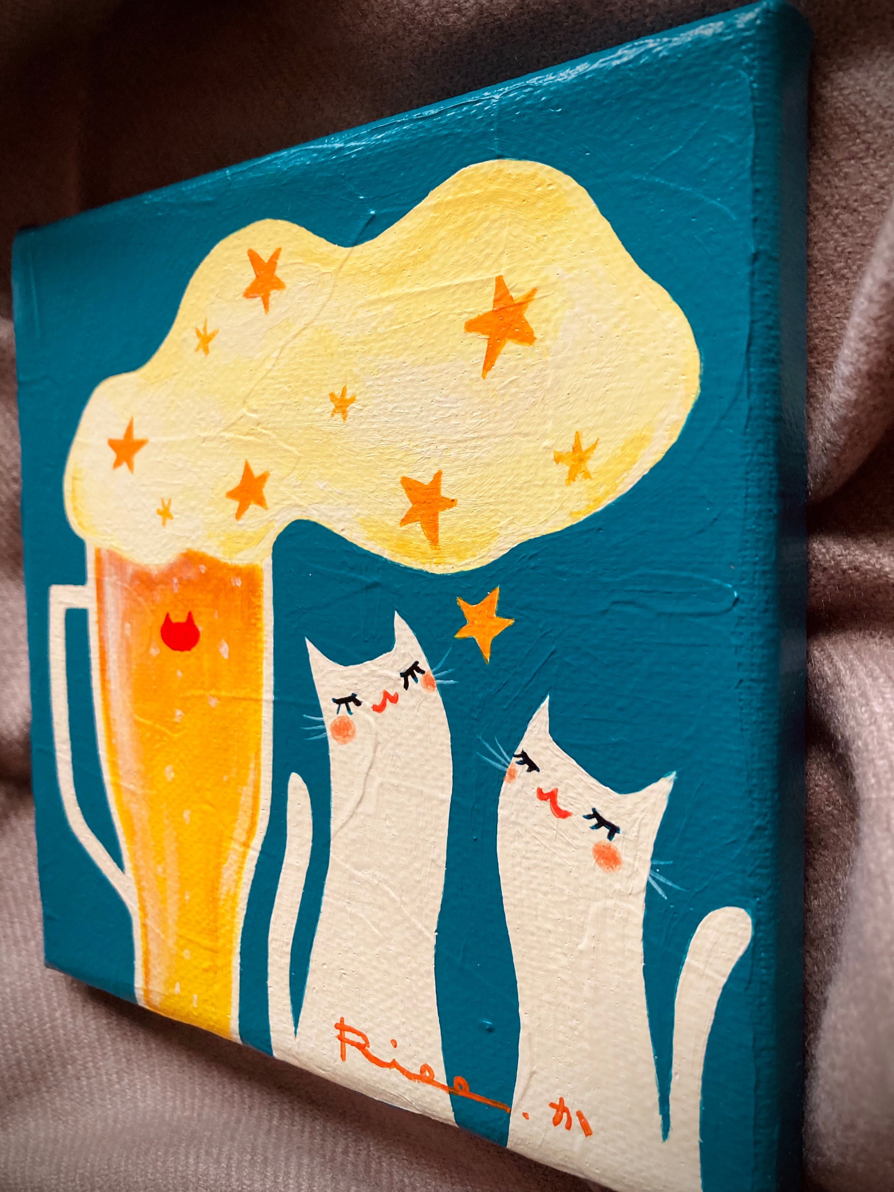 猫 白猫 ビール 星空 絵 アート イラスト 絵画 キャンバス インテリア お酒