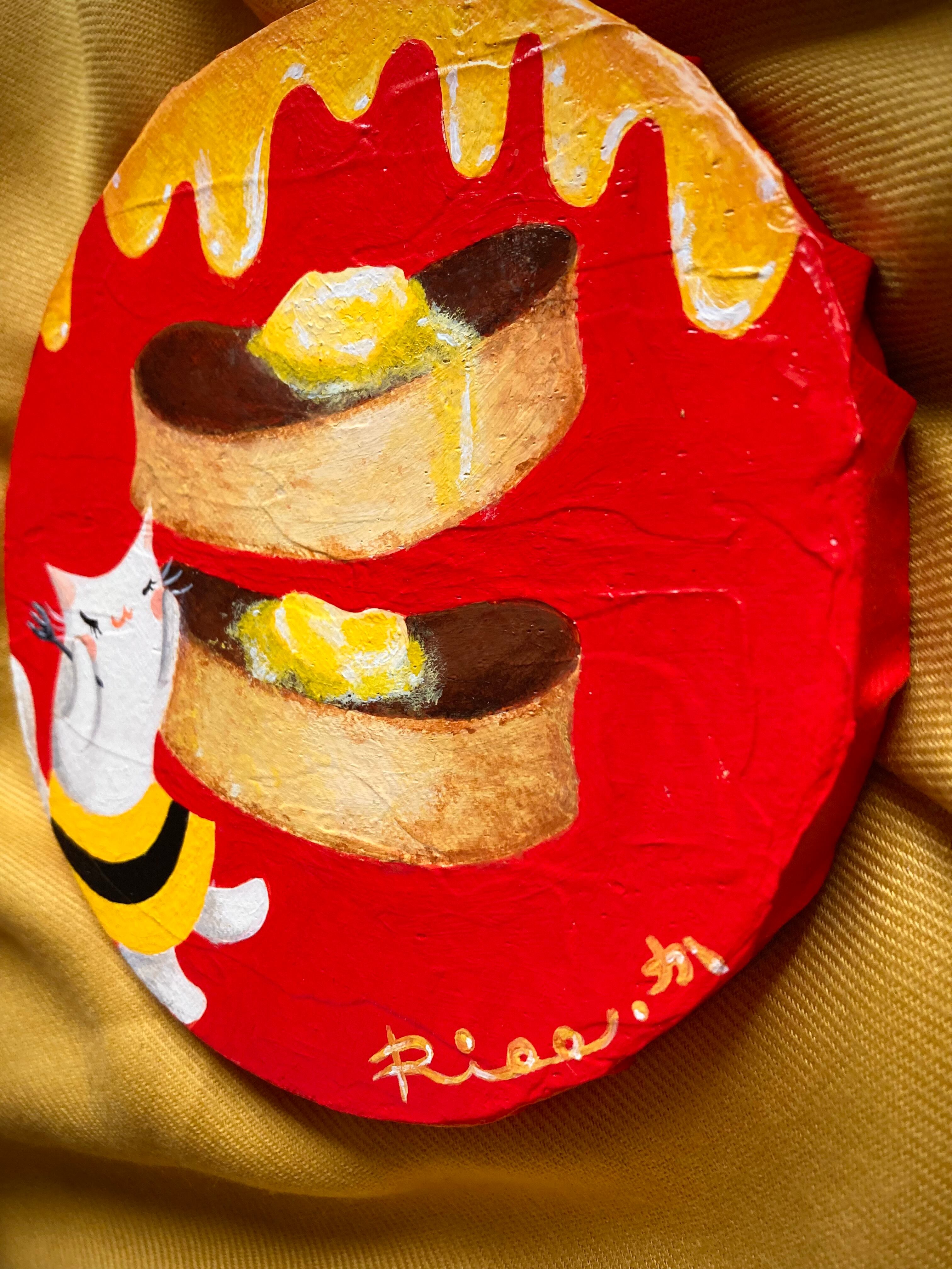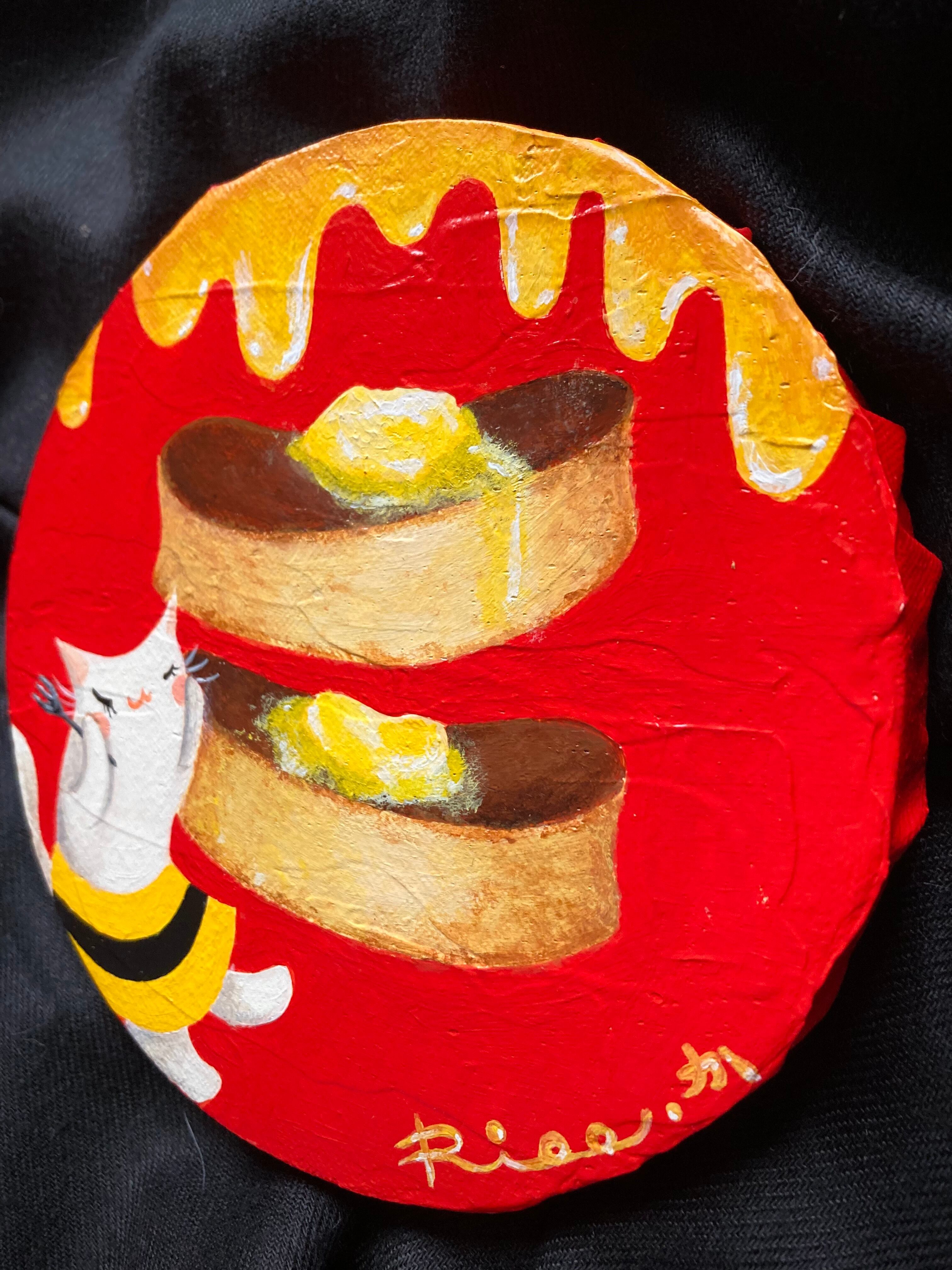 赤い背景にホットケーキとハチミツのカラーが可愛い作品。