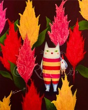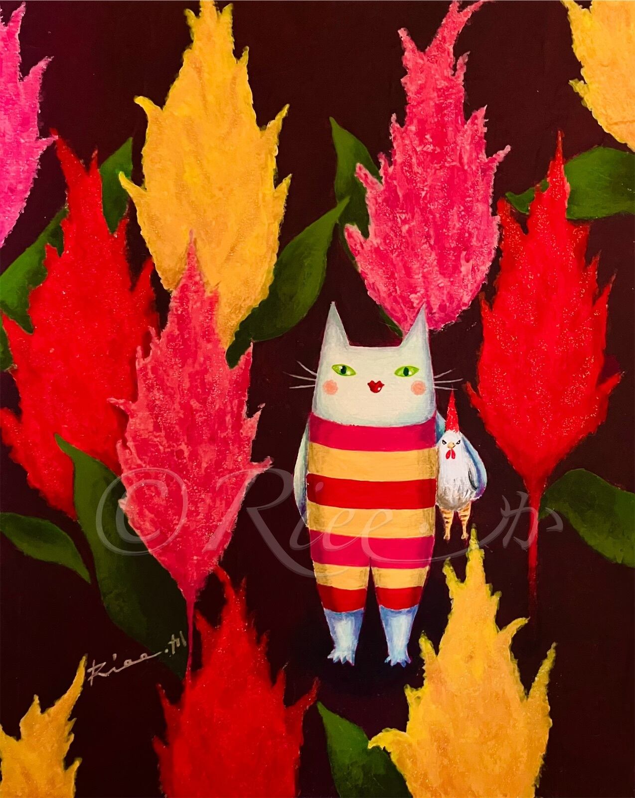 お花猫さんシリーズ「ケイトウランドへようこそ」の複製画。