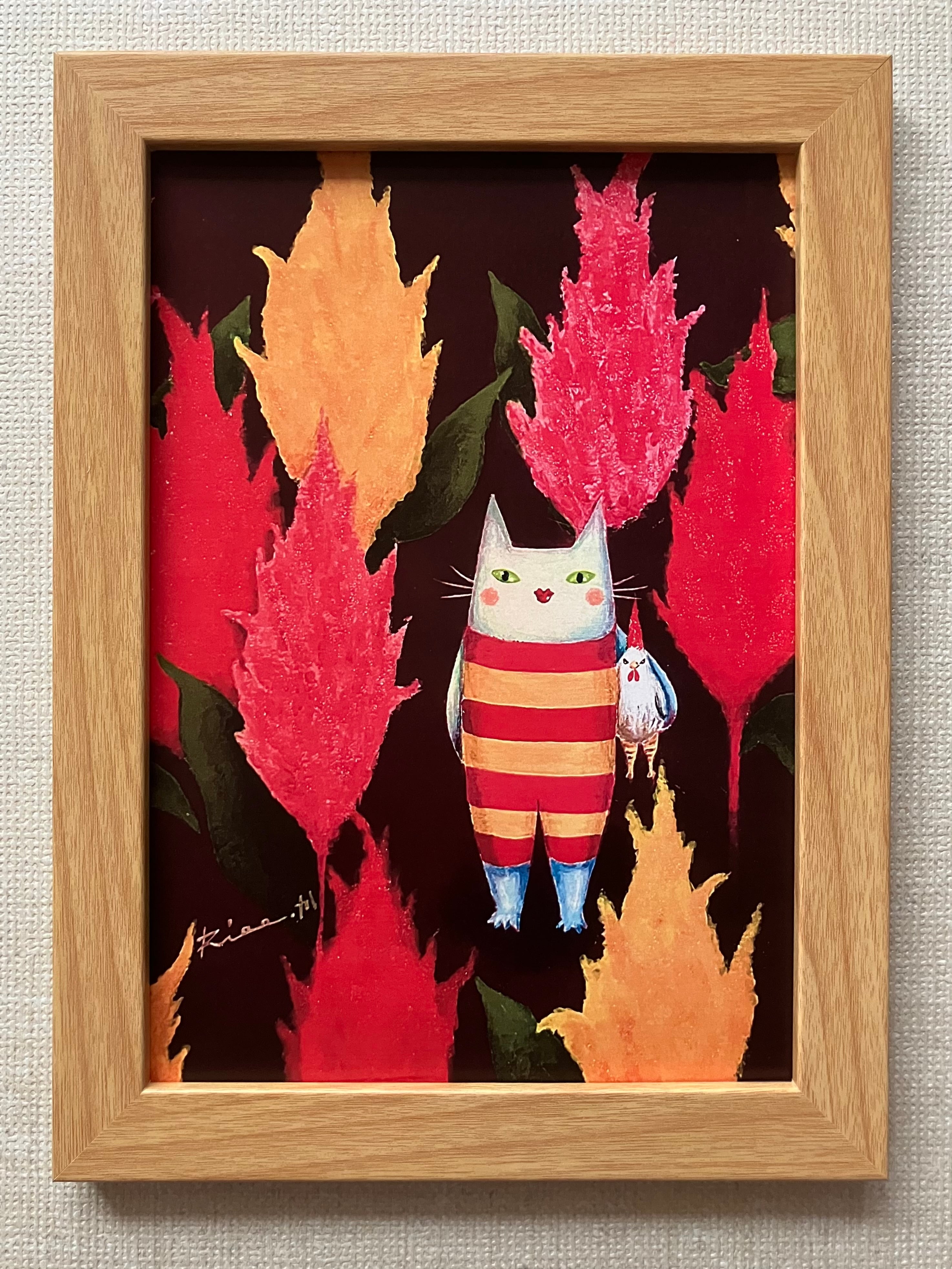 お花猫さんシリーズ「ケイトウ・ランドへようこそ」の複製画。